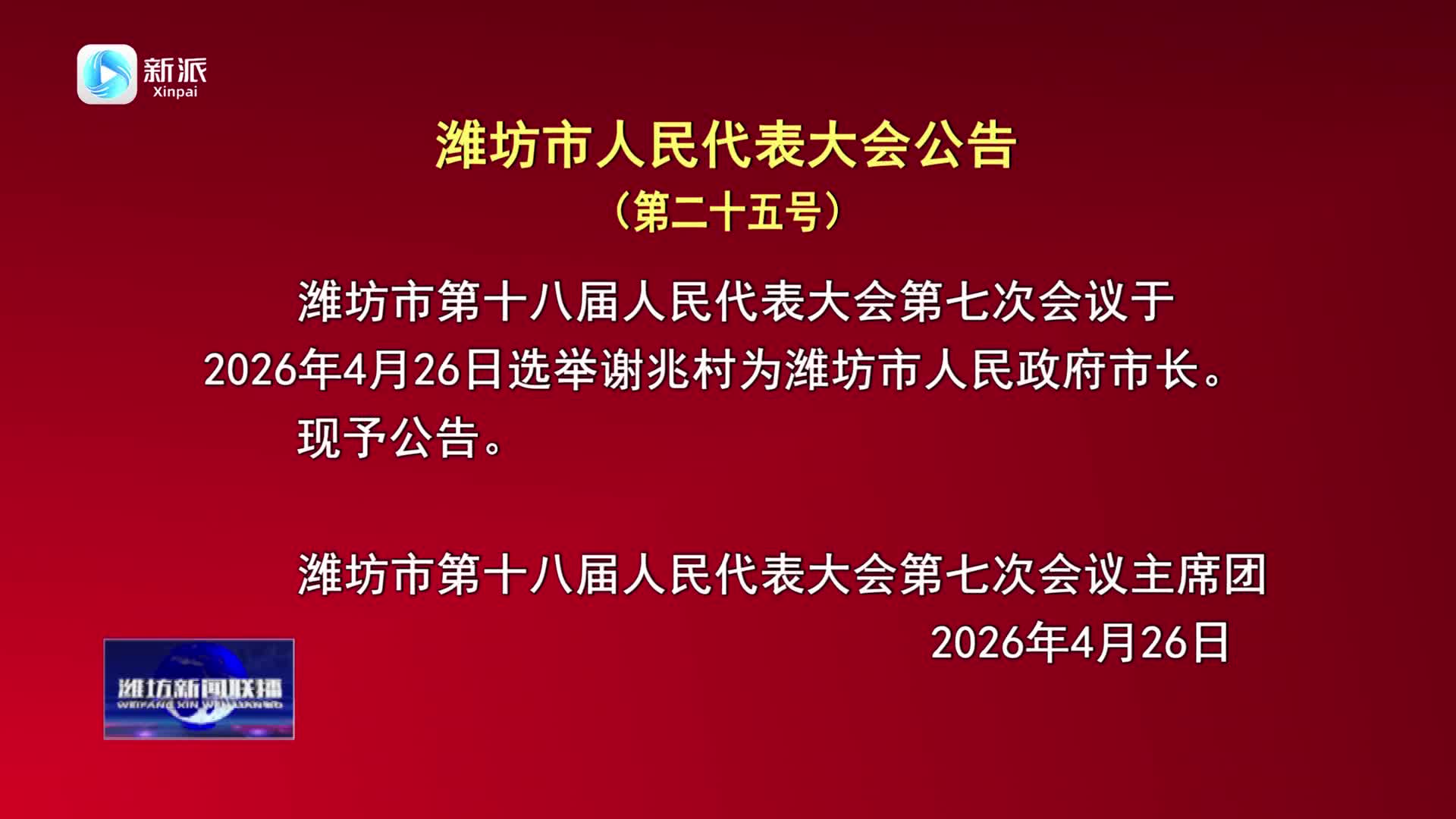 【濰坊新聞聯(lián)播】濰坊市人民代表大會(huì)公告(第二十五號(hào))