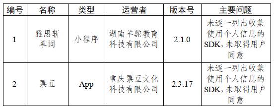 二、雅思斬單詞、票豆等2款A(yù)pp未逐一列出收集使用個人信息的SDK,未取得用戶同意(詳見下表)。