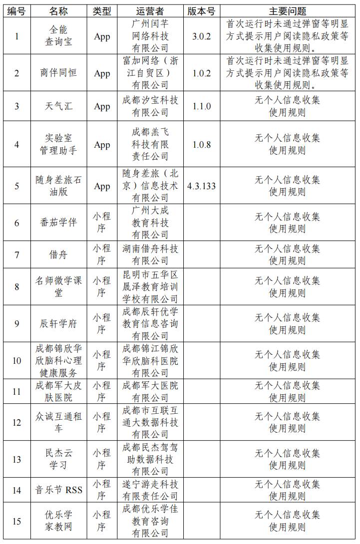 一、全能查詢寶、商伴同恒等15款A(yù)pp無個人信息收集使用規(guī)則或在首次運行時未通過彈窗等明顯方式提示用戶閱讀個人信息收集使用規(guī)則(詳見下表)。