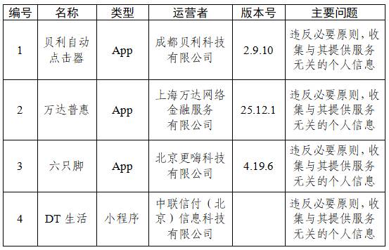 詳情:根據(jù)中央網(wǎng)信辦、工業(yè)和信息化部、公安部聯(lián)合發(fā)布的《關(guān)于開展2026年個人信息保護系列專項行動的公告》,依據(jù)《網(wǎng)絡(luò)安全法》《個人信息保護法》《網(wǎng)絡(luò)數(shù)據(jù)安全管理條例》《App違法違規(guī)收集使用個人信息行為認定方法》等法律法規(guī)和有關(guān)規(guī)定,中央網(wǎng)信辦組織對App(含小程序)收集使用個人信息行為進行檢測,現(xiàn)對有關(guān)問題予以通報: