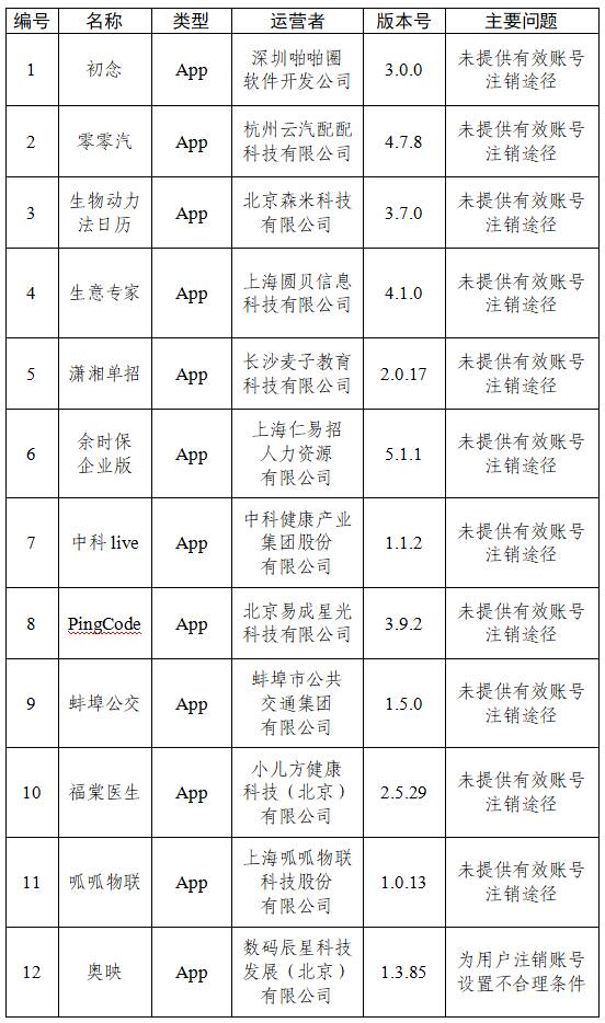 四、初念、零零汽等12款A(yù)pp未提供有效賬號注銷途徑或為用戶注銷賬號設(shè)置不合理條件(詳見下表)。