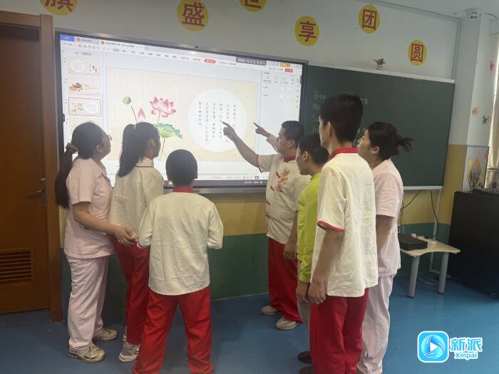 孩子們跟特教老師誦讀中秋節(jié)詩句。