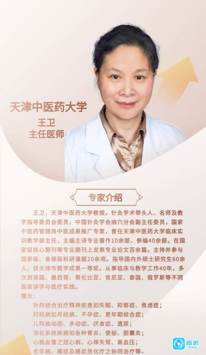 王衛(wèi),天津中醫(yī)藥大學(xué)教授,針灸學(xué)術(shù)帶頭人、名師及教學(xué)指導(dǎo)委員會(huì)委員,從事臨床與教學(xué)工作40年,多次到不同國(guó)家講學(xué)與醫(yī)療實(shí)踐。擅長(zhǎng)針?biāo)幗Y(jié)合治療精神疾患如失眠、抑郁癥、焦慮癥;婦科病如月經(jīng)不調(diào)、痛經(jīng)、不孕癥、更年期綜合癥;兒科抽動(dòng)癥、消化不良厭食癥、小兒遺尿;消化系統(tǒng)疾病如胃痛、腹瀉、便秘、膽囊炎;心腦血管疾患胸痹、心悸、高血壓;老年病與痛癥等。
