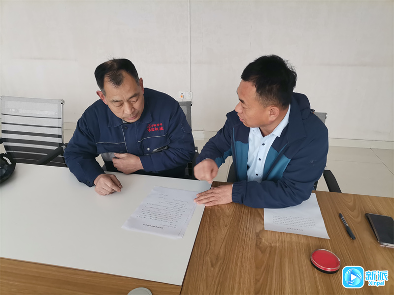 孔凡利(右)向企業(yè)負(fù)責(zé)人傳達(dá)政策法規(guī)。