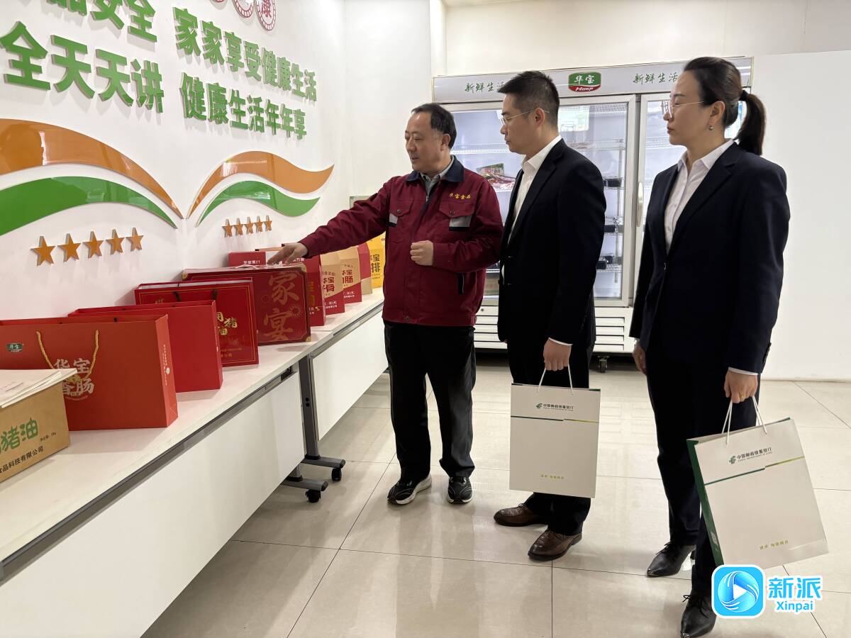 華寶食品股份有限公司工作人員向郵儲銀行工作人員介紹企業(yè)產(chǎn)品。