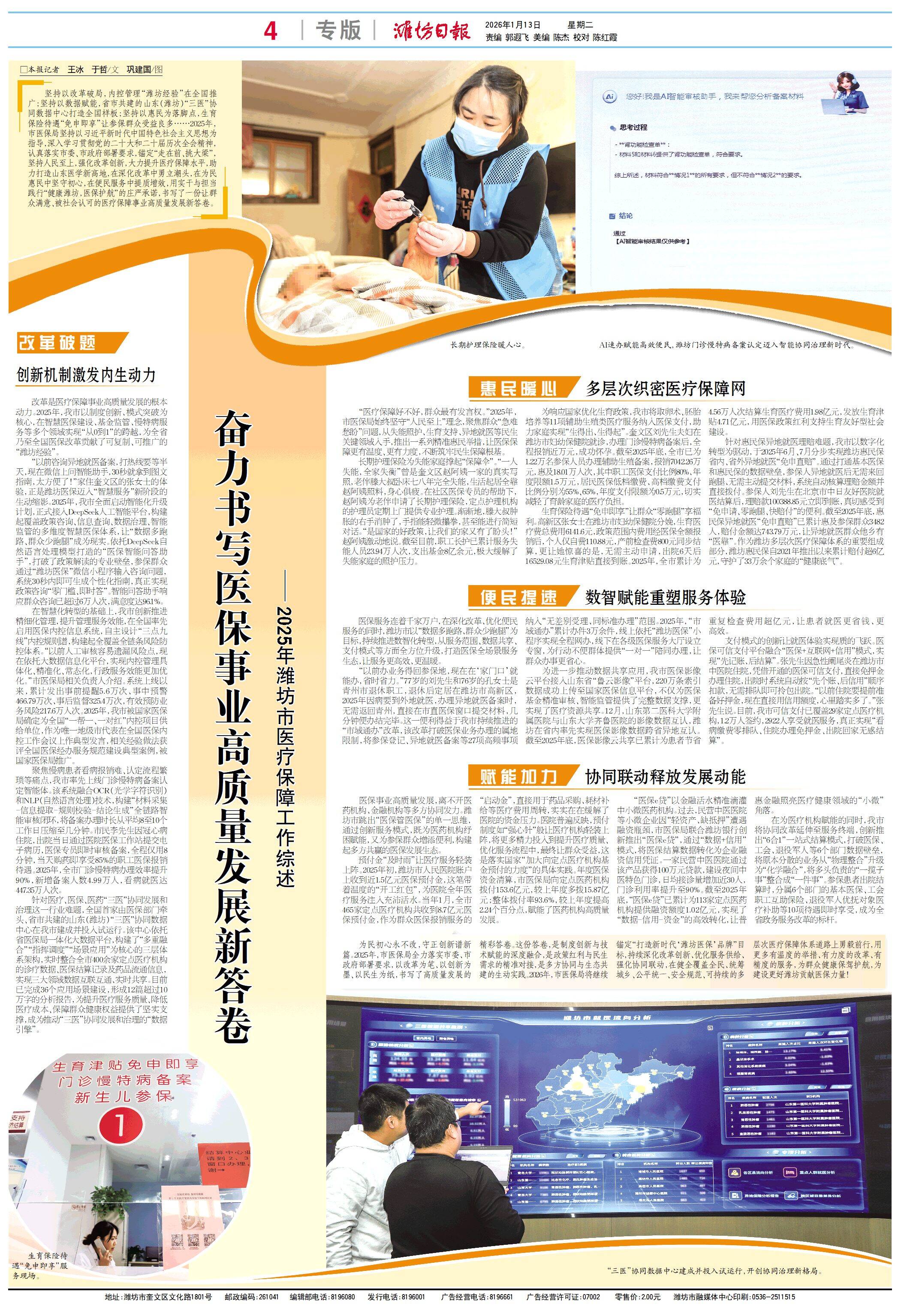 改革是醫(yī)療保障事業(yè)高質(zhì)量發(fā)展的根本動(dòng)力。2025年,我市以制度創(chuàng)新、模式突破為核心,在智慧醫(yī)保建設(shè)、基金監(jiān)管、慢特病服務(wù)等多個(gè)領(lǐng)域?qū)崿F(xiàn)“從0到1”的跨越,為全省乃至全國醫(yī)保改革貢獻(xiàn)了可復(fù)制、可推廣的“濰坊經(jīng)驗(yàn)”。