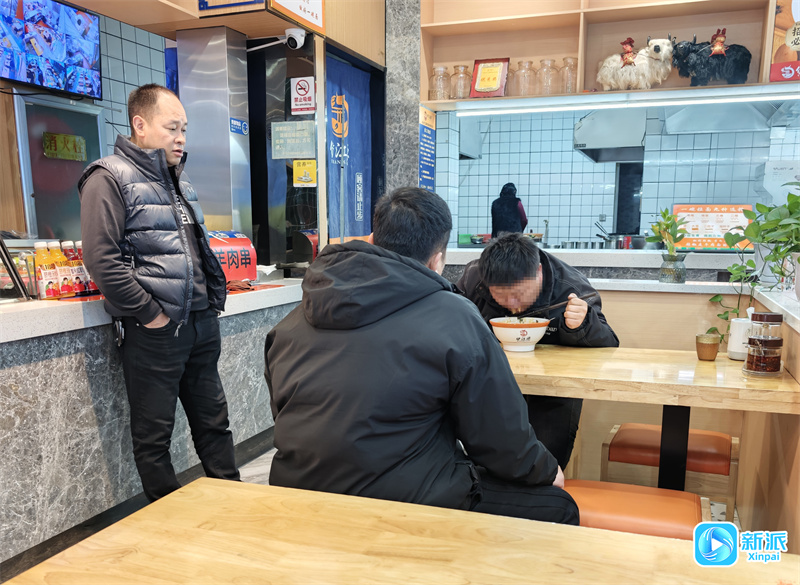 在得知該男子的情況后,王瑛沒(méi)有絲毫猶豫,對(duì)該男子說(shuō):“咱們先去吃一口熱乎的暖和一下,別的我們想辦法解決?!彪S后,王瑛將該男子帶到轄區(qū)愛(ài)心商戶伊江源面館內(nèi)。向面館老板說(shuō)明情況后,他二話不說(shuō)走進(jìn)廚房:“等著,馬上就好?!辈灰粫?huì)兒,一碗熱氣騰騰的面條端了上來(lái)?!俺园桑@碗面不收錢。”老板樸實(shí)的話語(yǔ)讓這位身處困境的異鄉(xiāng)人眼眶濕潤(rùn)。