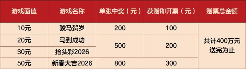 對于山東的購彩者朋友來說,一份專屬的溫暖已提前送達。自2026年1月12日起至2月19日,購彩者在山東省體彩銷售實體店購買2026馬年指定生肖主題彩票,無論是寓意美好的“駿馬賀歲”、“馬到成功”,還是年味十足的“搶頭彩2026”、“新春大吉2026”,只要單張彩票中得指定金額,經(jīng)銷售終端“快速促銷兌獎”模塊掃描成功后,即可現(xiàn)場獲贈對應(yīng)價值的即開票獎勵。具體活動內(nèi)容如下: