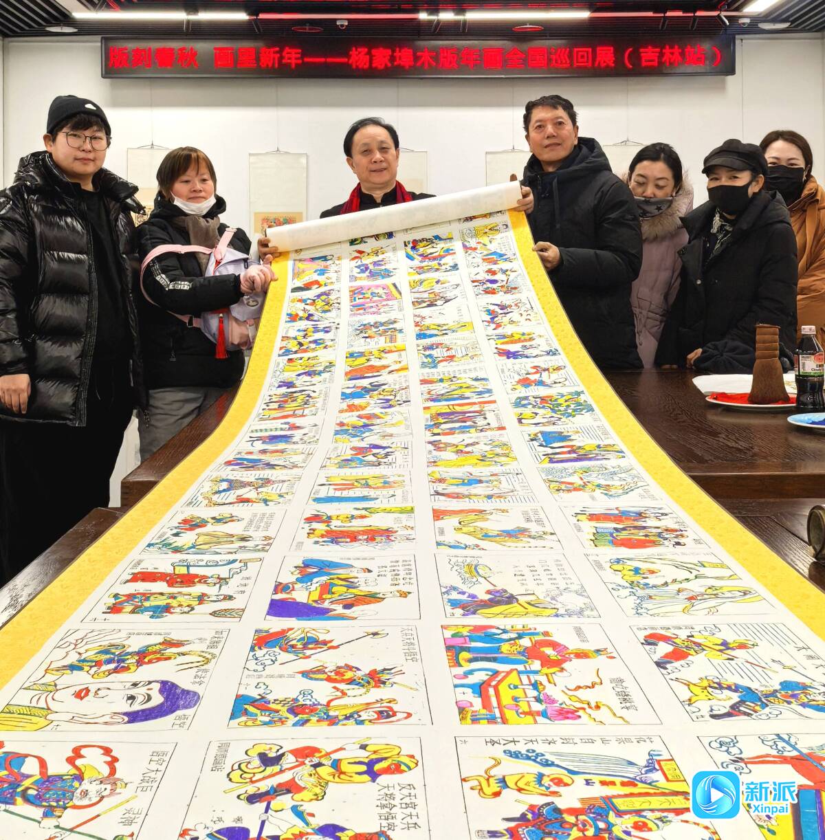 張大功在展覽現(xiàn)場(chǎng)與觀眾一起展示《西游記》木版年畫(huà)長(zhǎng)卷