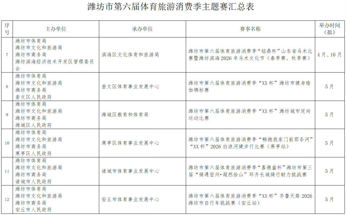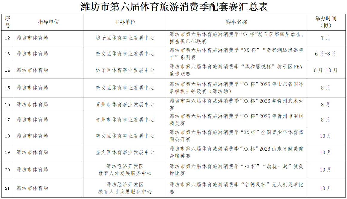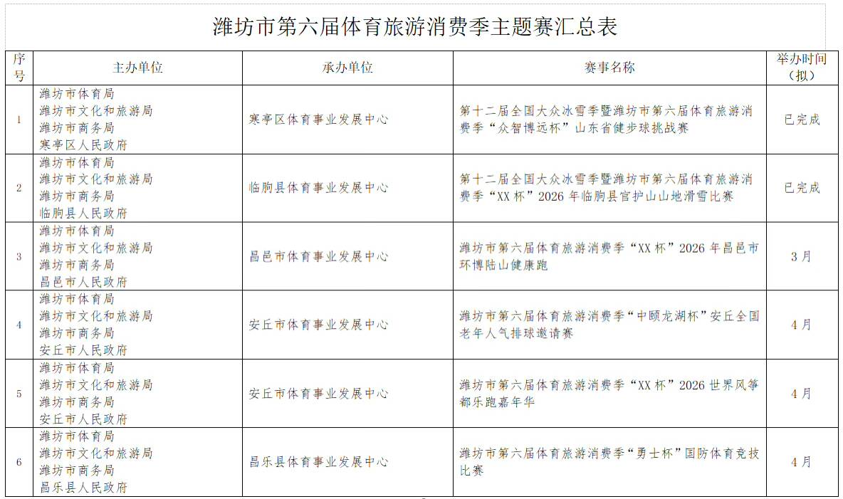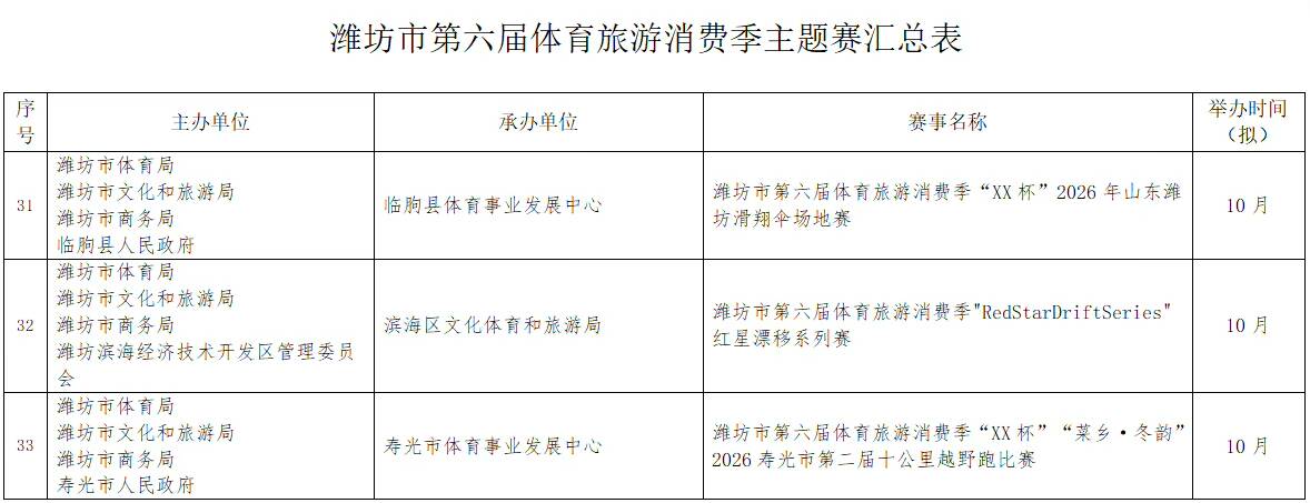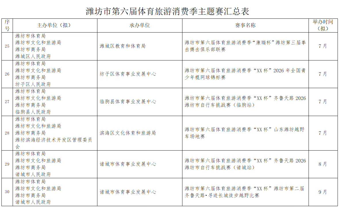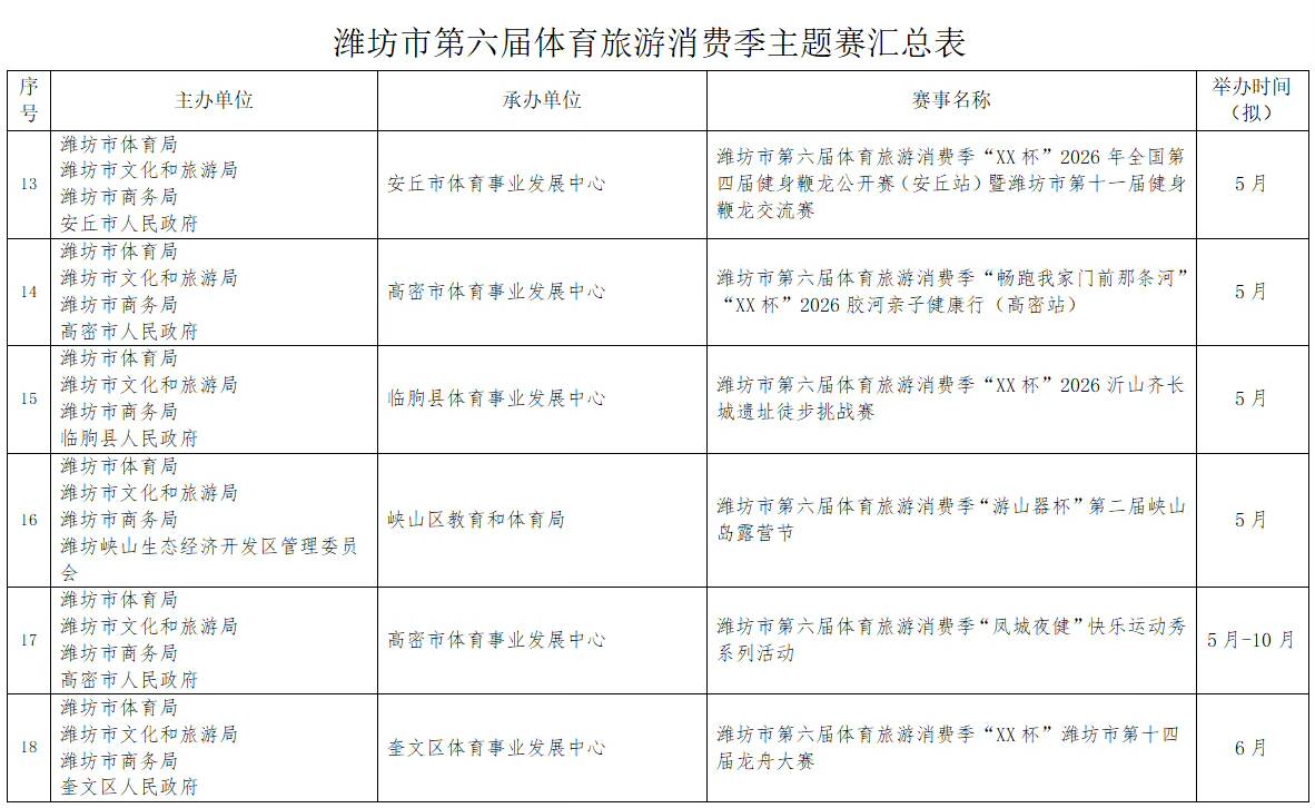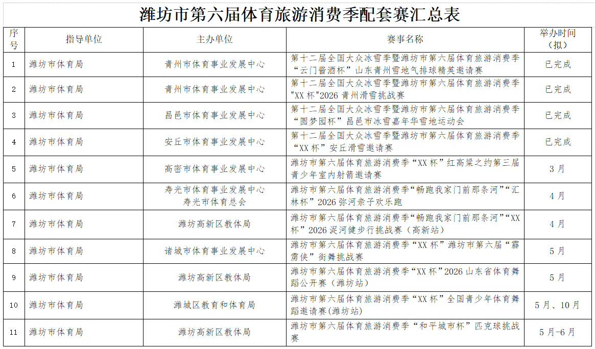 濰坊市第六屆體育旅游消費季確定了“RDS紅星漂移賽”國際性賽事,2026全國青少年棍網球錦標賽、全國青少年體育舞蹈邀請賽(濰坊站)等5項全國性賽事,山東省馬術比賽、山東省國際象棋棋士等級賽(濰坊站)等6項省級賽事。重點策劃了暢跑“我家門前那條河”系列賽(寒亭白浪河站、高密膠河站、壽光彌河站、高新浞河站)和齊魯天路自行車騎行系列賽(諸城站、安丘站、臨朐站三站)以及濰坊市第十三屆龍舟大賽系列賽(奎文鳶都湖站、臨朐彌河站)。另外,還有春節(jié)期間的“迎春消費季冰雪系列賽事”(駝山站、官護山站、青云山站)。