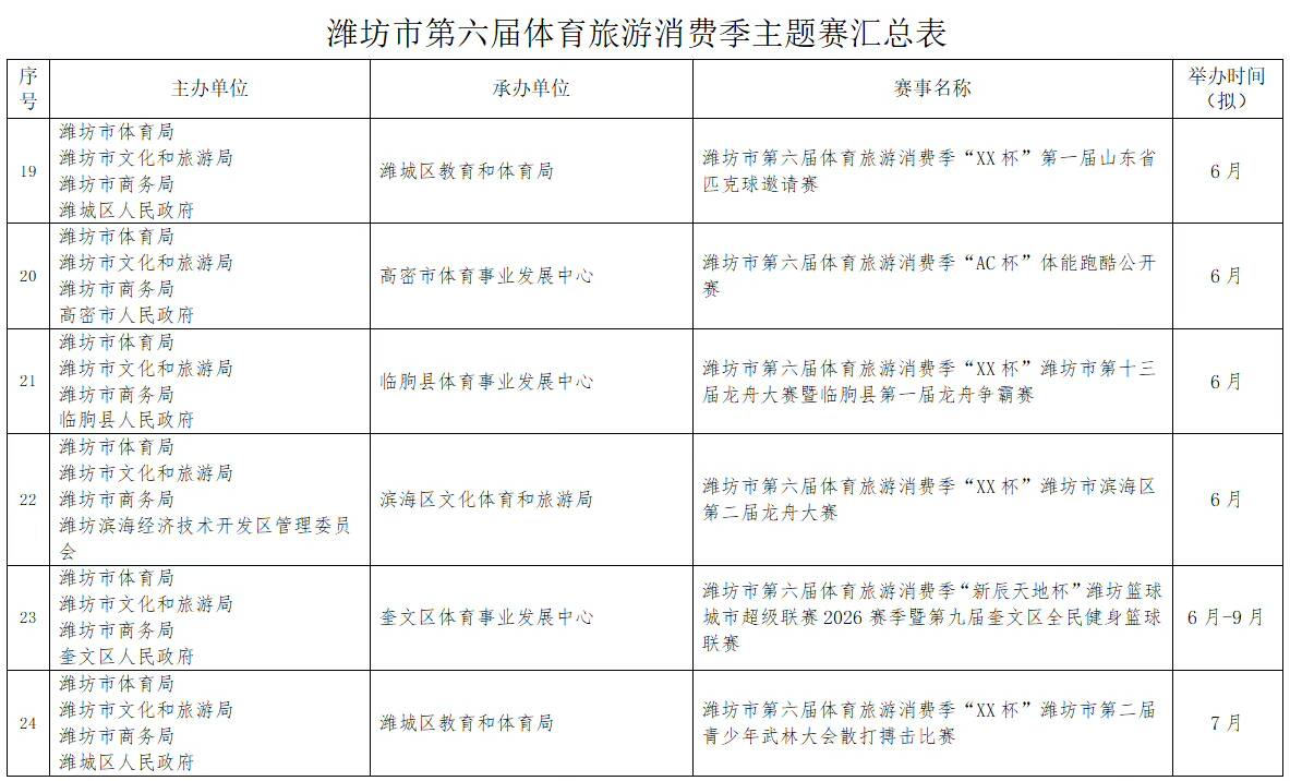 新派訊 為大力發(fā)展賽事經濟,進一步推動文體商旅深度融合,拓展體育消費新場景,激發(fā)賽事經濟,助力我市經濟社會高質量發(fā)展,近日,市體育局正式發(fā)布了以“逐夢山河湖海·悅動更好濰坊”為主題的濰坊市第六屆體育旅游消費季50多項賽事目錄。